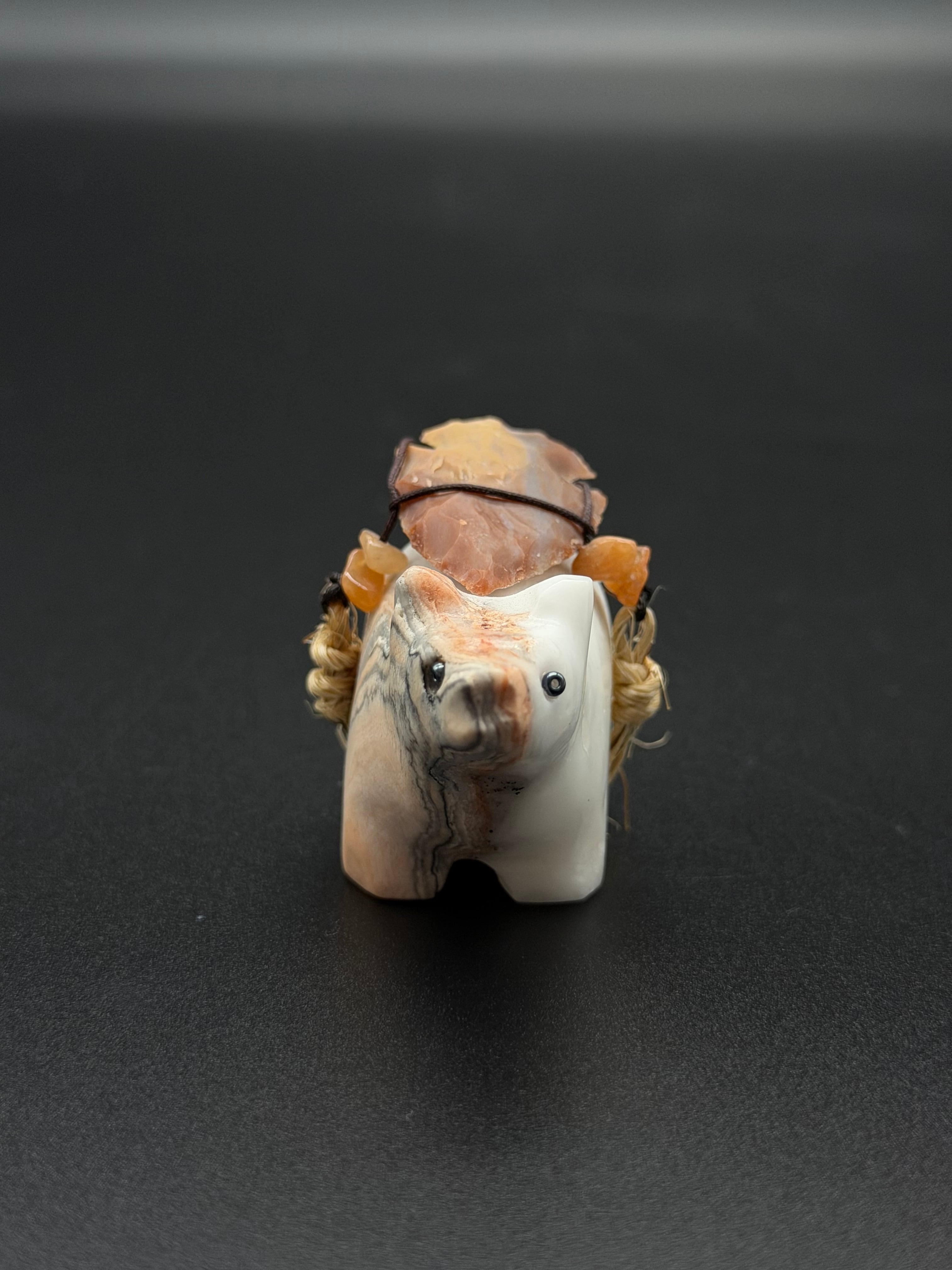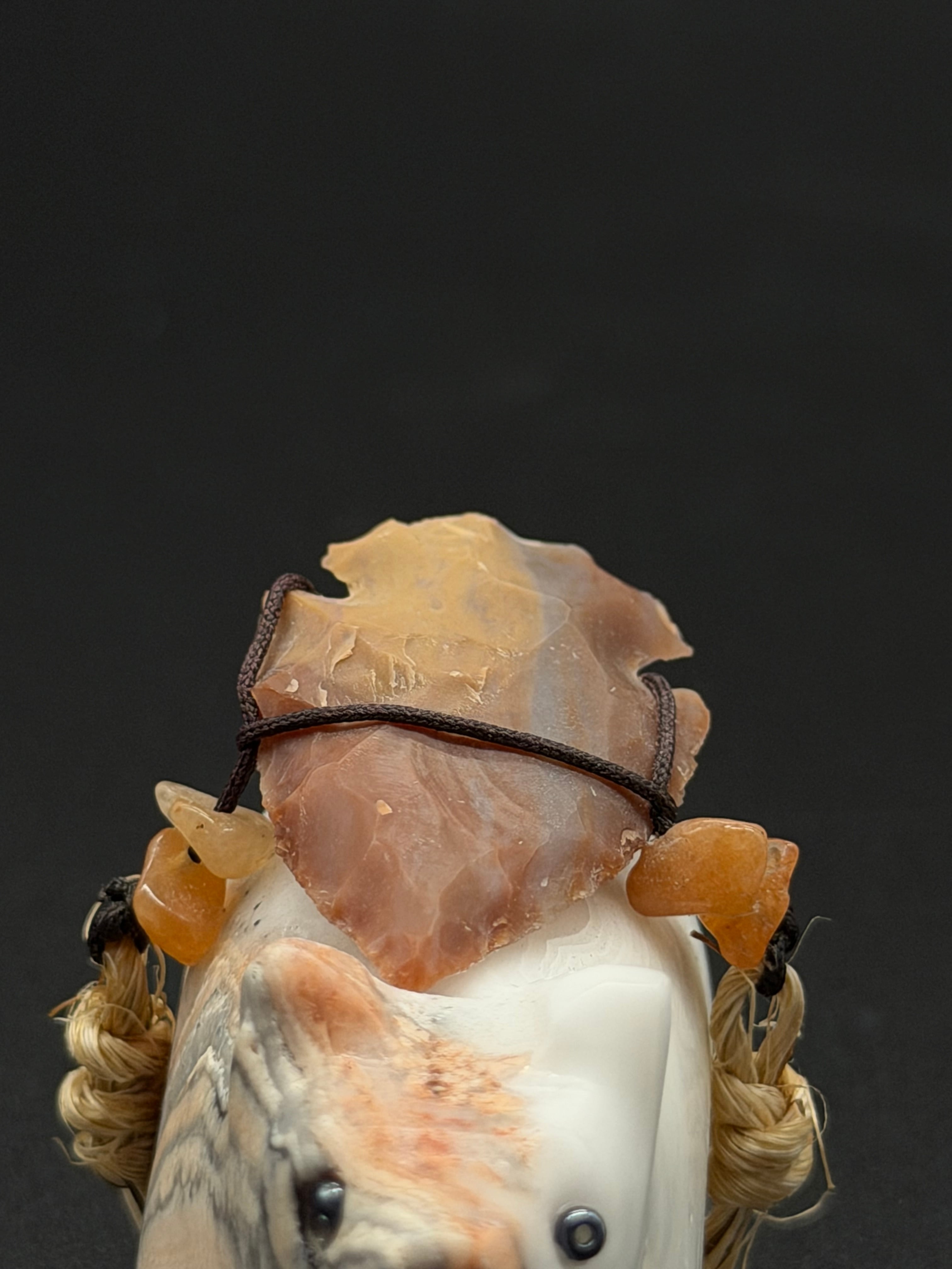 *背中の飾り:背中に石の破片(矢尻のような形)やビーズが紐で括り付けられています。これは**「メディスン・バンドル(MedicineBundle)」**と呼ばれ、その彫像のパワーを高めたり、神への捧げ物を意味したりします。